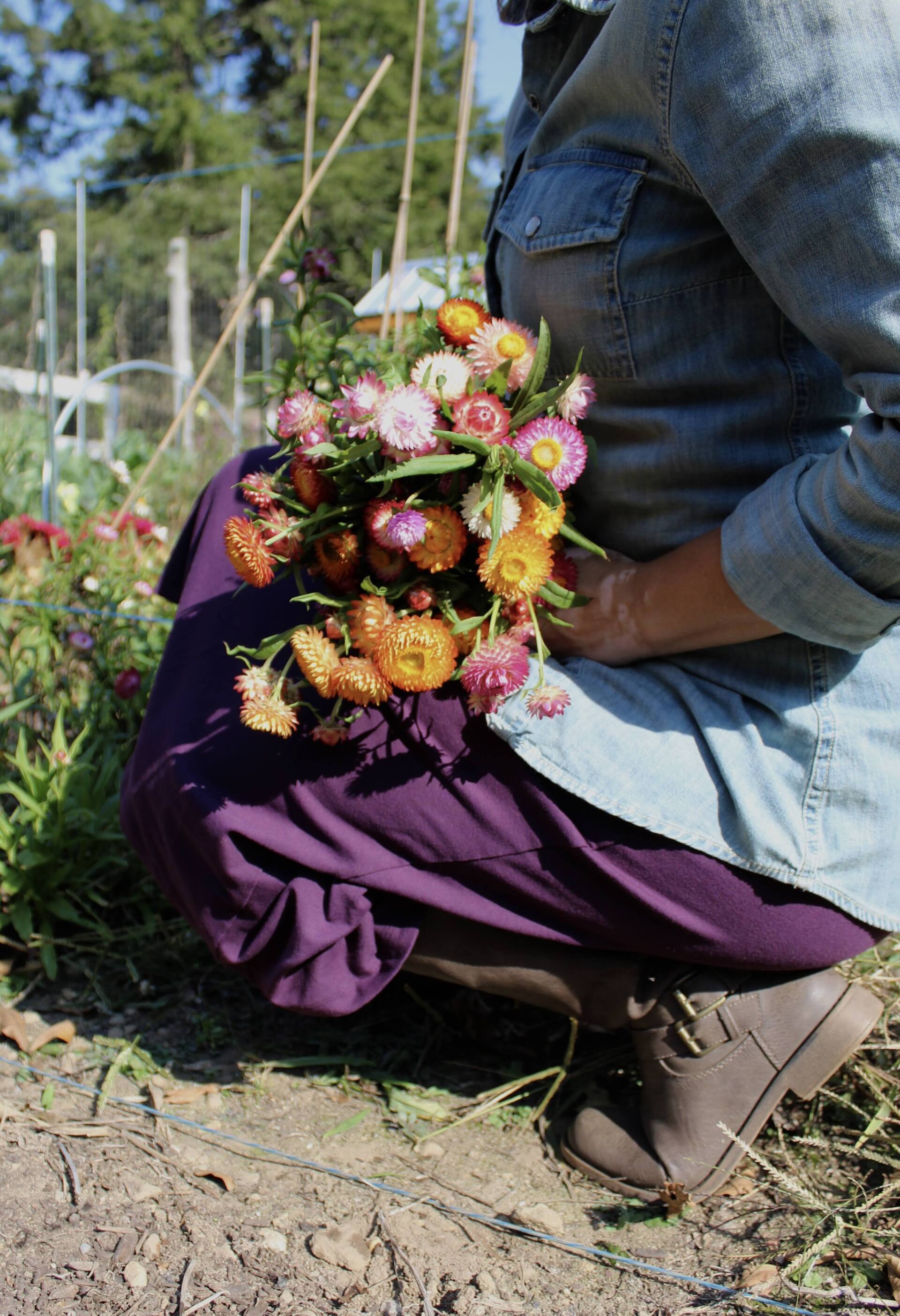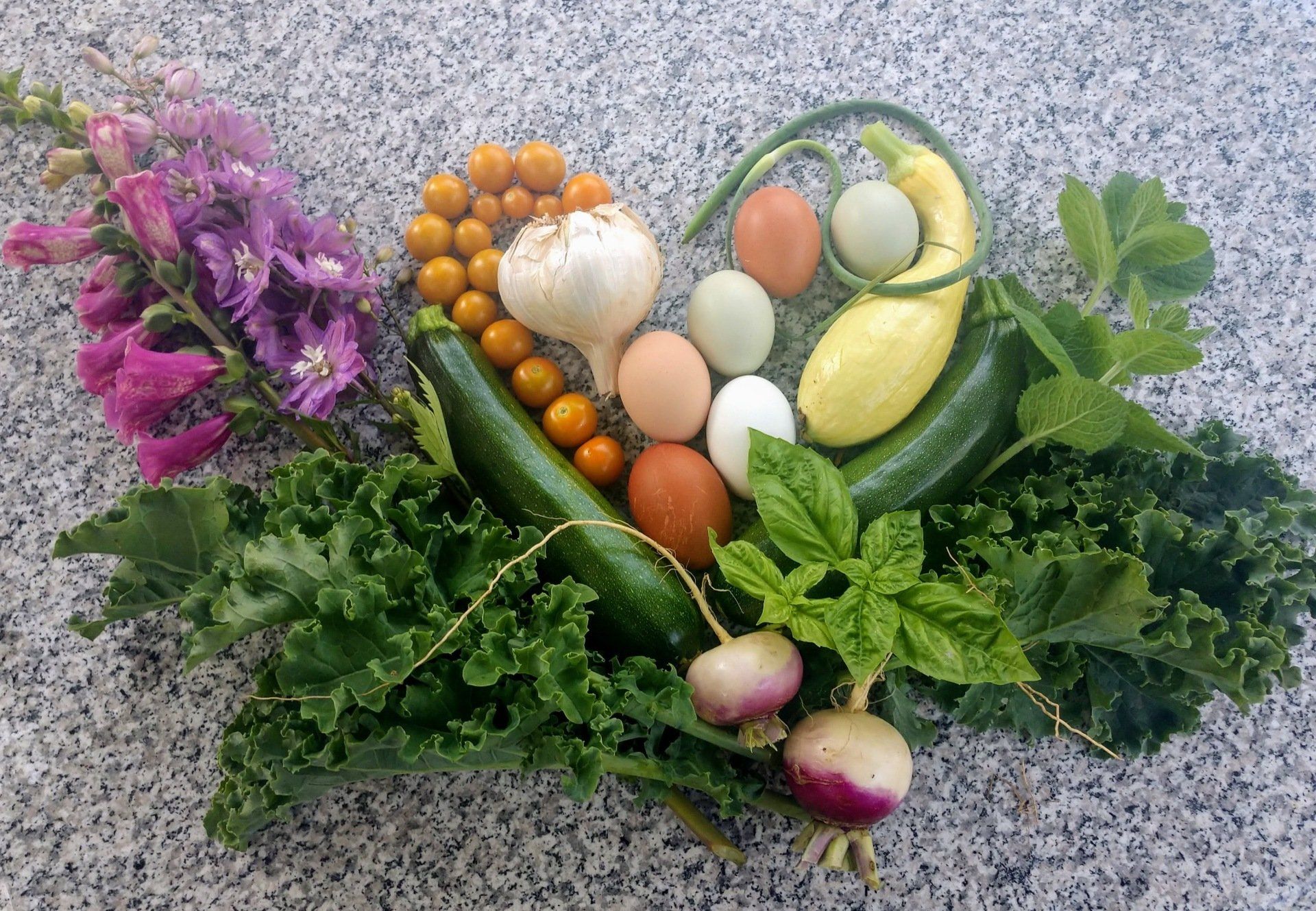 Everything we grow is organic and our chickens are free-ranged. Our eggs are a bounty of colors like the flowers!