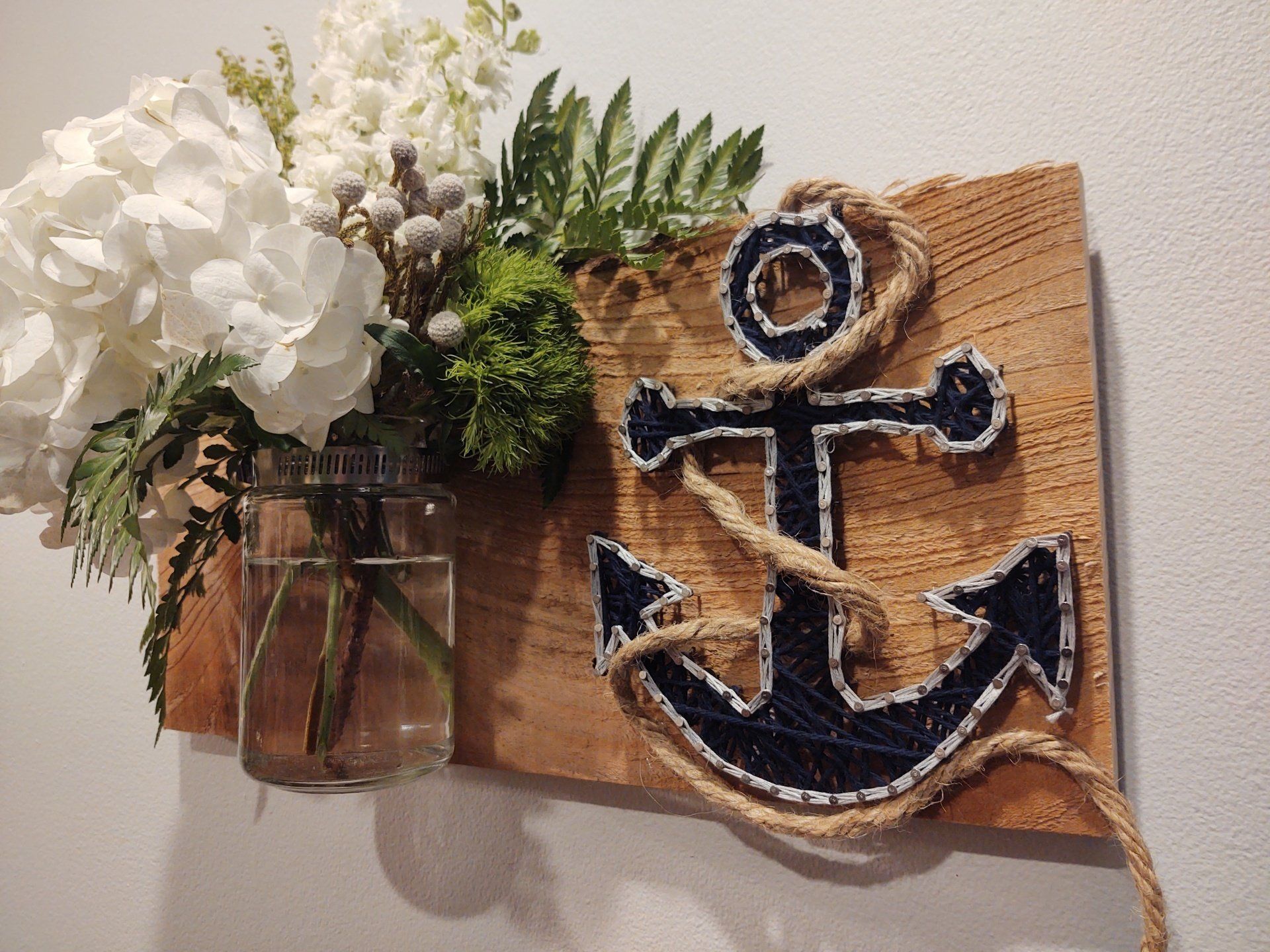 - String art on barn wood with an attached vase