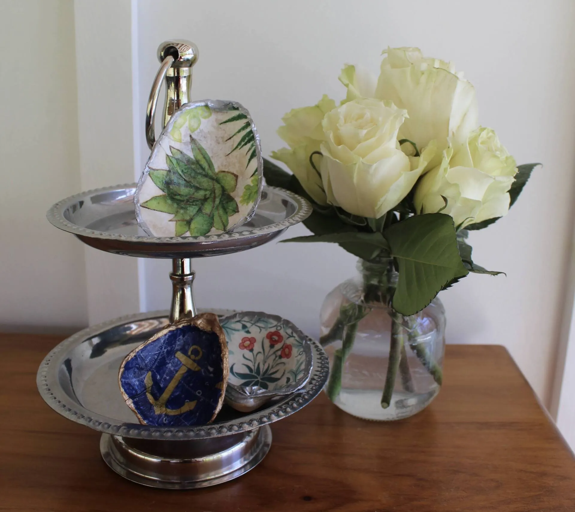 - 3 decoupaged shells to adorn a vase of your choosing
